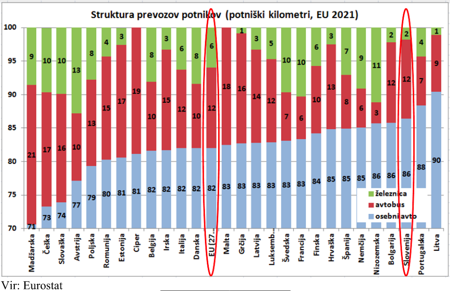 Na spodnji sliki je prikazana struktura prevozov potnikov merjeno po potniških kilometrih po državah EU. Za bolj realno spremljanje obsega prevozov potnikov in blaga se v statistiki praviloma uporabljajo potniški (PKM) ali ton kilometri (TKM). To so merske enote, ki predstavljajo prevoz enega potnika ali ene tone blaga na en kilometer kar omogoča bolj realno primerjavo. Iz podatkov je razvidno, da je delež prevozov potnikov z železnico relativno nizek, le dobra 2 odstotka vseh prevozov, medtem ko je v povprečju EU 6 odstotkov. To seveda potrjuje oceno o nizki uporabi železniškega prevoza, a za oceno možnosti je vseeno mogoče bolj pomemben drug podatek. V vseh državah se giblje delež prevozov z osebnimi avtomobili med 82 in 86 odstotki (ostalo je avtobusni prevoz), kar pomeni relativno majhne razlike. Tudi v primeru podvojitve železniškega prevoza, bo pretežni del prevoza ljudi še vedno potekal z osebnimi avtomobili, saj bi se obseg tovrstnega prevoza znižal le za dobra dva odstotka. Podpora prehodu  na električne avtomobile bo ta delež mogoče celo povečal, vsekakor pa ne znižal. Objektivno moramo torej upoštevati, da bi se tudi ob močno povečanih vlaganjih v železnice, pretežni del prebivalstva še vedno prevažal z osebnimi avtomobili. Glede na razpršenost poselitve, je to v Sloveniji še bolj izrazito. In v tem kontekstu je kljub želeni spremembi strukture prevoza, potrebno upoštevati tudi stroškovni vidik in učinkovitost vlaganja v železnice.
