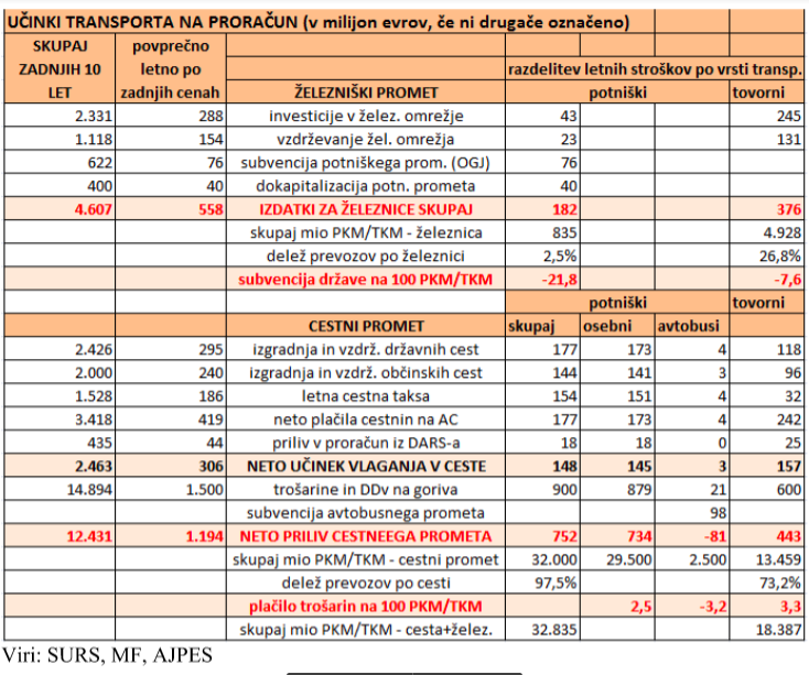 Na levi strani tabele so najprej navedeni skupni podatki v povezavi z železniškim transportom v Sloveniji. Sistem funkcionira tako, da država gradi (financira) vsa vlaganja v železniško infrastrukturo ter tudi plačuje pretežni del delovanja železniškega omrežja, prevozniki, predvsem Slovenske železnice in v manjši meri tudi tuji operaterji pa to omrežje koristijo in zanj tudi nekaj plačujejo – a seveda še zdaleč ne vseh stroškov delovanja omrežja. Po proračunskih dokumentih je tako država v zadnjih desetih letih v izgradnjo in predvsem obnovo železniškega omrežja vložila 2,3 milijarde evrov ali 288 milijonov eur povprečno letno zadnjih cenah. Takšni so bili izdatki proračuna, ki so bili sicer v pomembni meri financirani s sredstvi Evropske Unije, a to vseeno lahko razumemo kot vlaganja Slovenije v železniško omrežje. Če sredstev EU ne bi porabili za ta namen, bi z njimi financirali druge projekte. Pa tudi sicer smo v zadnjih desetih letih 62 % pridobljenih sredstev iz EU zagotavljali z vplačilom prispevka v proračun EU, pri čemer se ta delež z rastjo razvitosti Slovenije povečuje. Zaenkrat smo še neto prejemnica sredstev iz EU, a sčasoma bomo vsa prejeta sredstva zagotovili pravzaprav kar sami. Zaradi tega lahko štejemo omenjenih 2,3 milijarde državnih vlaganja v železniško omrežje kot izdatek državnega proračuna.