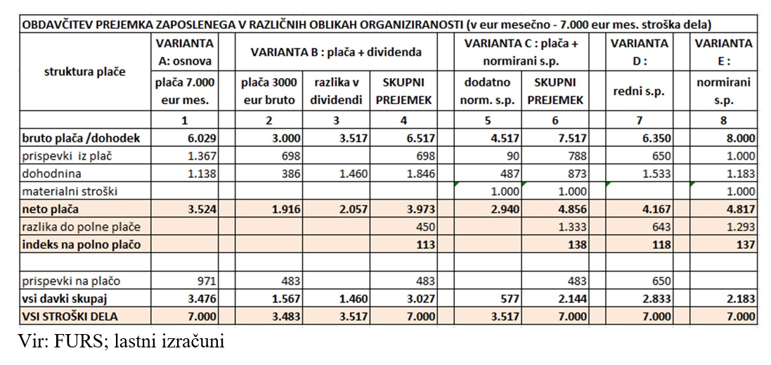 Seveda imamo glede teh izračunov lahko veliko zadržkov in vse opcije razumljivo niso uporabne za vse zaposlene. Če nekomu podjetje namenja 7.000 eur bruto stroška dela, je to lahko samo v obliki plače. Če pa gre za družbo v lasti posameznika, pa si ta lahko del prejemkov izplačuje tudi v obliki dividend, kar je davčno ugodneje in kar seveda veliko podjetnikov tudi prakticira. Če pa nekdo za dodatno delo izven firme denimo zasluži 40 tisoč eur letno, pa bo davčno bistveno ugodneje obravnavan, če to fakturira kot normirani samostojni podjetnik. Tudi tu imamo sicer precej omejitev in potrebno je izpolniti določene pogoje, da lahko dodatno delo opravljamo preko normiranega s.p., a če bi te osebe danes opravljale to delo v obliki redne ali povečane plače je nesporno, da bi bila davčna bremena bistveno višja. Zaradi tega se je v zadnjih letih tudi tako močno povečalo število tovrstnih podjetnikov.