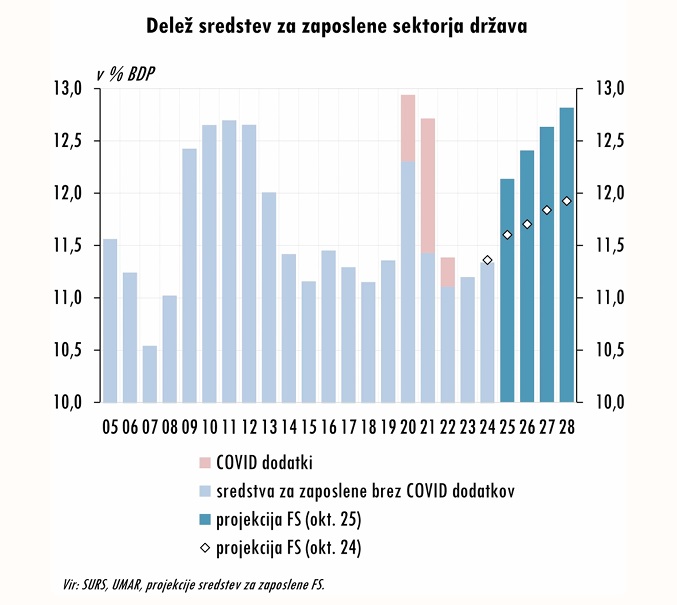 Simulacije Fiskalnega sveta kažejo nevzdržno povečevanje stroškov dela v javnem sektorju v naslednjih letih, ki ga generira nekritično poviševanje plač brez osnovnih kriterijev uspešnosti. (Slika: Fiskalni svet)