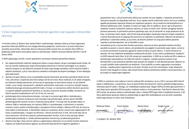 V Zvezi organizacij pacientov Slovenije so razočarani nad vsebino in tonom reakcije Zdravniške zbornice Slovenije. Posebej jih žalosti dejstvu, da so z ZZS 4. januarja 2023 sklenili Izjavo o sodelovanju v prepričanju, da je za spremembe zdravstvenem sistemu potrebno dogovarjanje, reševanje spornih zadev v dialogu ter medsebojno spoštovanje. Slogan ZOPS je “Enoten glas pacientov” in zato razume javno sporočilo ZZS kot poskus vnašanja razdora v vrste pacientov. Tudi številni zdravniki, ki so člani ZZS, menijo, da sprejem zakona o psihoterapiji nujen, a njihova zbornica doslej tega nikoli ni predstavila javnosti. V javnosti je močno zaznati veliko podporo zakonu o psihoterapiji, gas proti zakonu tako dobesedno postaja glas proti ljudem. Z dvajsetletno obstrukcijo sprejema Zakona o psihoterapiji se zgolj ščiti nedotakljivost ene od strok s področja duševnega zdravja na račun vseh državljanov.