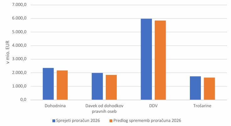 Po podatkih ministrstva za finance nova ocena prihodkov davka od dohodkov pravnih oseb temelji na obračunih dobičkov podjetij v letu 2025, ki so osnova za določitev akontacij v letu 2026. Skupni prihodki v letu 2026 bodo nižji za 154,8 mio EUR oziroma 7,8 % (!) glede na oceno iz sprejetega proračuna 2026 in bodo na letni ravni znašali 1.84 mrd EUR. Sicer pa ne padajo samo prilivi od davka na dobiček, ampak praktično vsi glavni viri proračuna, kar bi moralo že pred meseci prižgati vse alarme, predvsem pa bi morala vlada zajeziti ekscesno trošenje pri nestrateških projektih.