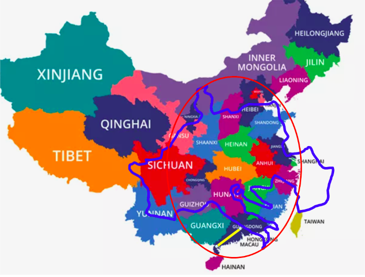Na sliki spodaj je zemljevid Kitajske (po provincah) za primerjavo velikosti glede na EU. Na sliki je celotna Kitajska s skupaj skoraj 10 milijoni kvadratnih kilometrov površine. A pretežni del prebivalstva in tudi industrije je skoncentriranega na osrednjem, priobalnem delu, obkroženem z rdečo črto. Na tem območju, velikem okoli 2,5 milijona km2, živi približno 1,1 milijarde prebivalcev, torej tri četrtine celotne populacije države. In kot rečeno, na tem ožjem območju poteka tudi velik del celotne proizvodnje in je vir ekonomske moči Kitajske.