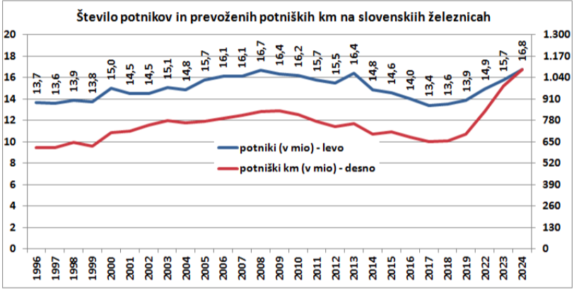 In kje smo v teh razmerah v Sloveniji? Imamo resda enega najmanjših deležev prevoza potnikov po železnici v Evropi, čeprav pa smo v primeru primerjave deleža po cestah le 4 odstotke “zadaj” (98 % delež cestnega prometa pri nas v primerjavi s 94 % v EU). Na drugi sliki so prikazani podatki o številu potnikov Slovenski železnic v notranjem in mednarodnem prometu. Kot vidimo, je število postopno naraščalo do leta 2008, nato pa začelo upadati do najslabšega rezultat 13,4 milijona potnikov v letu 2018 (močan upad zaradi covida v letih 2020 in 2021 ni prikazan). Zadnja leta se število ponovno povečuje in lani je s 16,8 milijona potnikov preseglo dosedanji rekord leta 2008. Še bolj se je povečalo število prevoženih potniških kilometrov, kjer zadnjih 5 let beležimo kar 68 % rast. Poleg četrtinskega povečanja števila potnikov v zadnjih letih se je za tretjino povečala tudi povprečna dolžina prevožene trase na enega potnika.