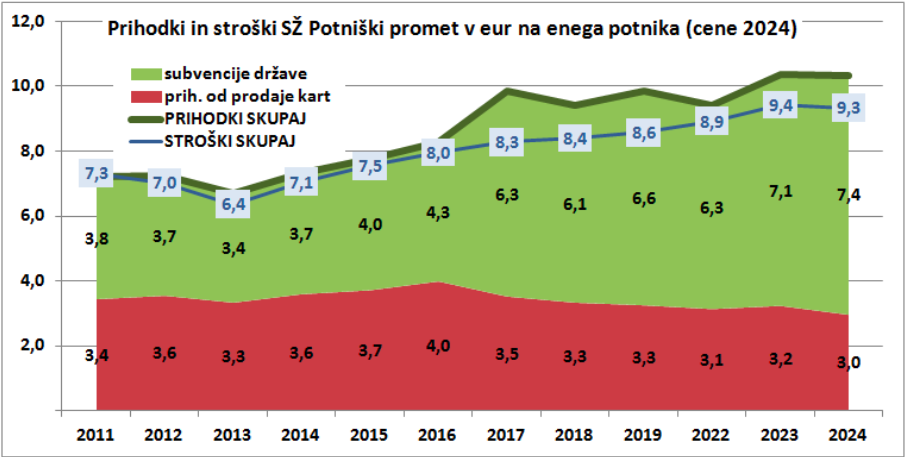 Takšnim gibanjem je nedvomno botrovala tudi politika spodbujanja železniškega prometa predvsem z ugodnimi cenami, zastonj prevozom za določene skupine uporabnikov (npr. upokojence) ter tudi visokimi zneski finančnih spodbud. Na tretji sliki (spodaj) je zanimiv prikaz povprečne cene prevoza potnikov na Slovenskih železnicah za zadnjih 14 let, preračunano v stalne cene 2024 (torej z izločeno inflacijo). Realno se je skupen strošek poslovanja družbe SŽ Potniški promet d.o.o. od leta 2011 povečal iz 7,3 na 9,3 evrov, preračunano na enega prepeljanega potnika. Ob tem pa je potnik za eno vožnjo po stalnih cenah lani plačal manj kot leta 2011, le 3,0 evre na eno vožnjo glede nekdanjih 3,4 evrov. Višje stroške poslovanja pa z dvigovanjem subvencij za “izvajanje obvezne gospodarske javne službe” (OGJS) pokriva država, tako da družba izkazuje preko 10 milijonov evrov dobička. Lani je tako država za OGJS namenila že 124 milijonov evrov, leta 2011 le 45. Beležimo torej precejšnje povečanje potnikov na železnici, a vse povečanje pravzaprav v celoti financira država iz proračunskih sredstev.